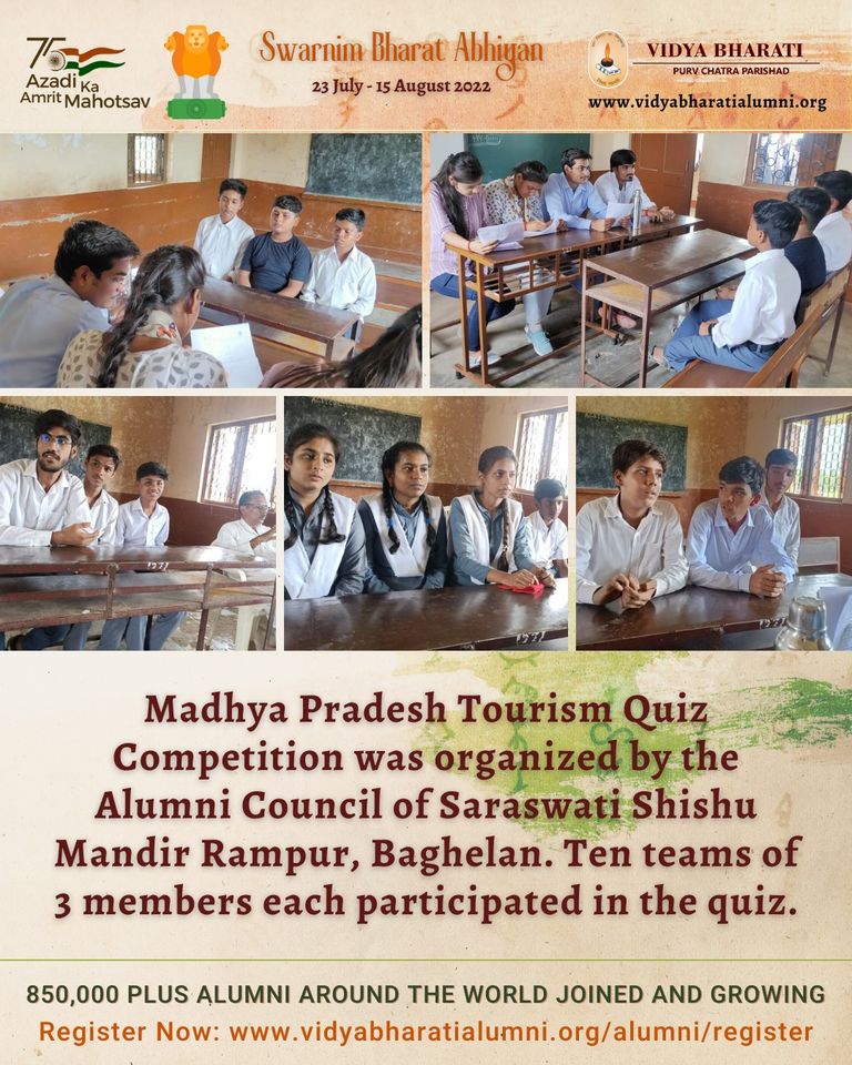 Madhya Pradesh Tourism Quiz Competition was organized by the Alumni Council of Saraswati Shishu Mandir Rampur, Baghelan. Ten teams of 3 members each participated in the quiz.