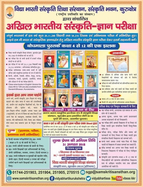 In the year 1980, the Sanskriti Gyan Pariksha was started for Upper Primary classes with the important purpose of transferring the cultural pride of the country to a new generation. At that time 30,000 students were involved in this examination. Gradually this number increased and in 2018-19, about 21 lakhs 47 thousand students were enrolled in this examination.