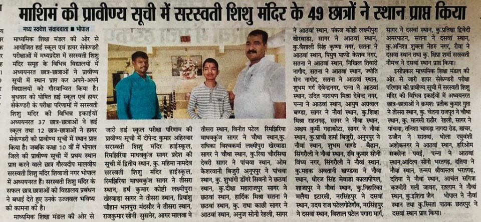 49 students of Saraswati Shishu Mandir Samuh secured positions at Class 10 and Class 12 Board Examinations. 37 students are from high school and 12 students are from higher secondary schools who have done excellent results at Saraswati Shishu Mandir Madhya Pradesh