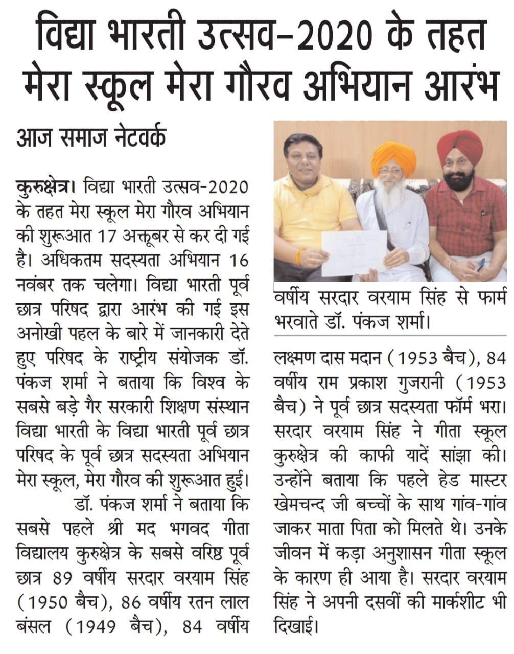 Vidya Bharati Festival 2020 ,My school My Pride - 89 year old Shri Varyam Singh Ji (1950 batch) of SMB Gita, Kurukshetra filled the alumni membership form and wished the campaign success. Shri Varyam Singh was born on 10/07/1931