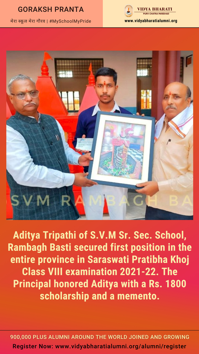 Aditya Tripathi of S.V.M Sr. Sec. School, Rambagh Basti secured first position in the entire province in Saraswati Pratibha Khoj Class VIII examination 2021-22. The Principal honored Aditya with a Rs. 1800 scholarship and a memento.
