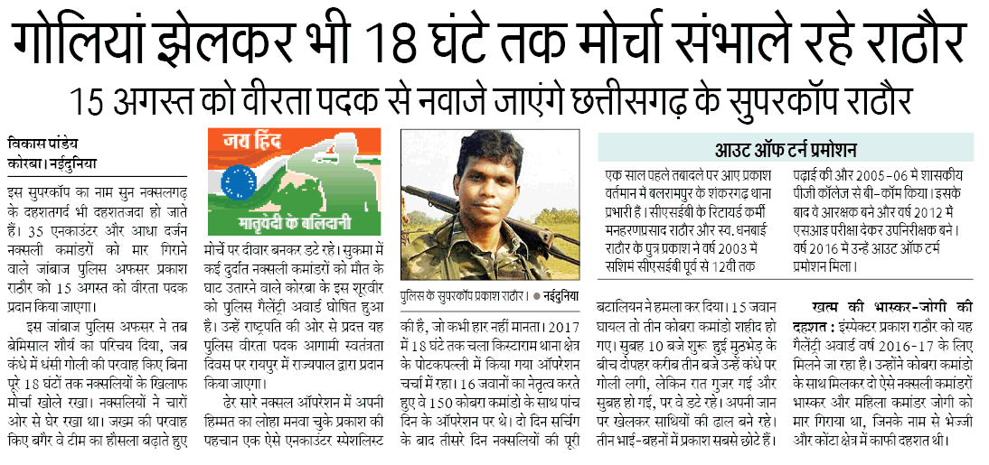 Rathore, who is considered as an encounter specialist had fought with unmatched valor against the Naxalites for 18 hours, and killed several of them regardless of being wounded with a bullet in his shoulder in 2017.