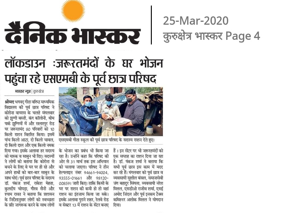 Alumni of SMB. Gita Sr. Sec School, Railway Road, Kurukshetra, donated grocery to 80 families residing slums near the area. The residents were also made aware regarding preventative measure to be taken regarding COVID 19 pandemic.