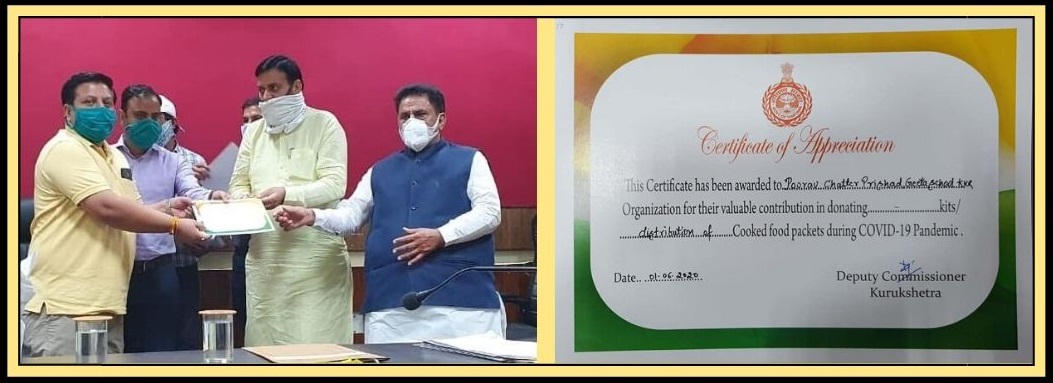 Alumni of SMB. Gita Sr. Sec School, Railway Road, Kurukshetra was honoured for 56 days non-stop social work by Dist. Administration, MP Shri Nayab Saini, MLA Shri Subhash Sudha and DC Shri Dhirendra Kumar, IAS for helping needy people during Covid 19 lockdown.