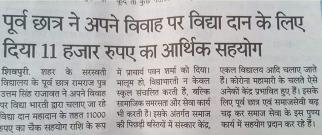 Ramraj Kushwaha, a former student of Saraswati Vidyapeeth Shivpuri, donated Rs 11000 to his school on his marriage.
