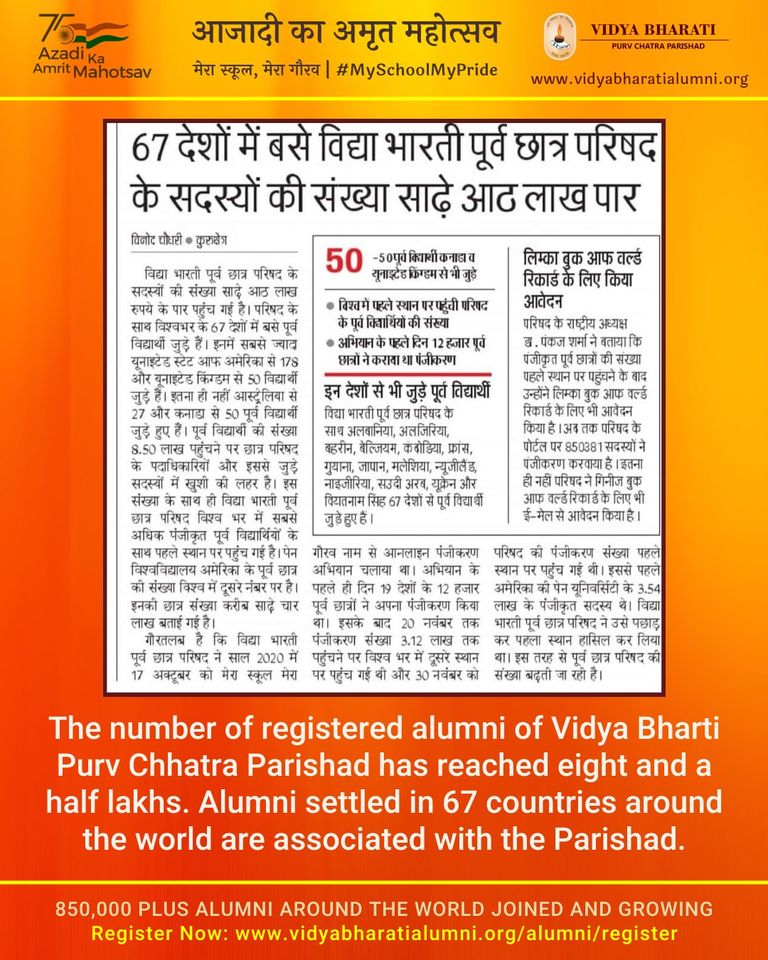 The number of registered alumni of Vidya Bharti Purv Chhatra Parishad has reached eight and a half lakhs. Alumni settled in 67 countries around the world are associated with the Parishad.