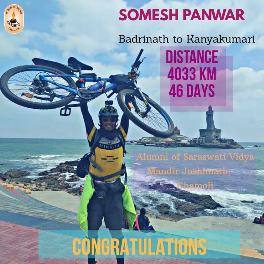 Alumni of Vidya Bharati, Somesh Panwar from Uttarakhand coverd 4033 KM in just 46 days on cycle.