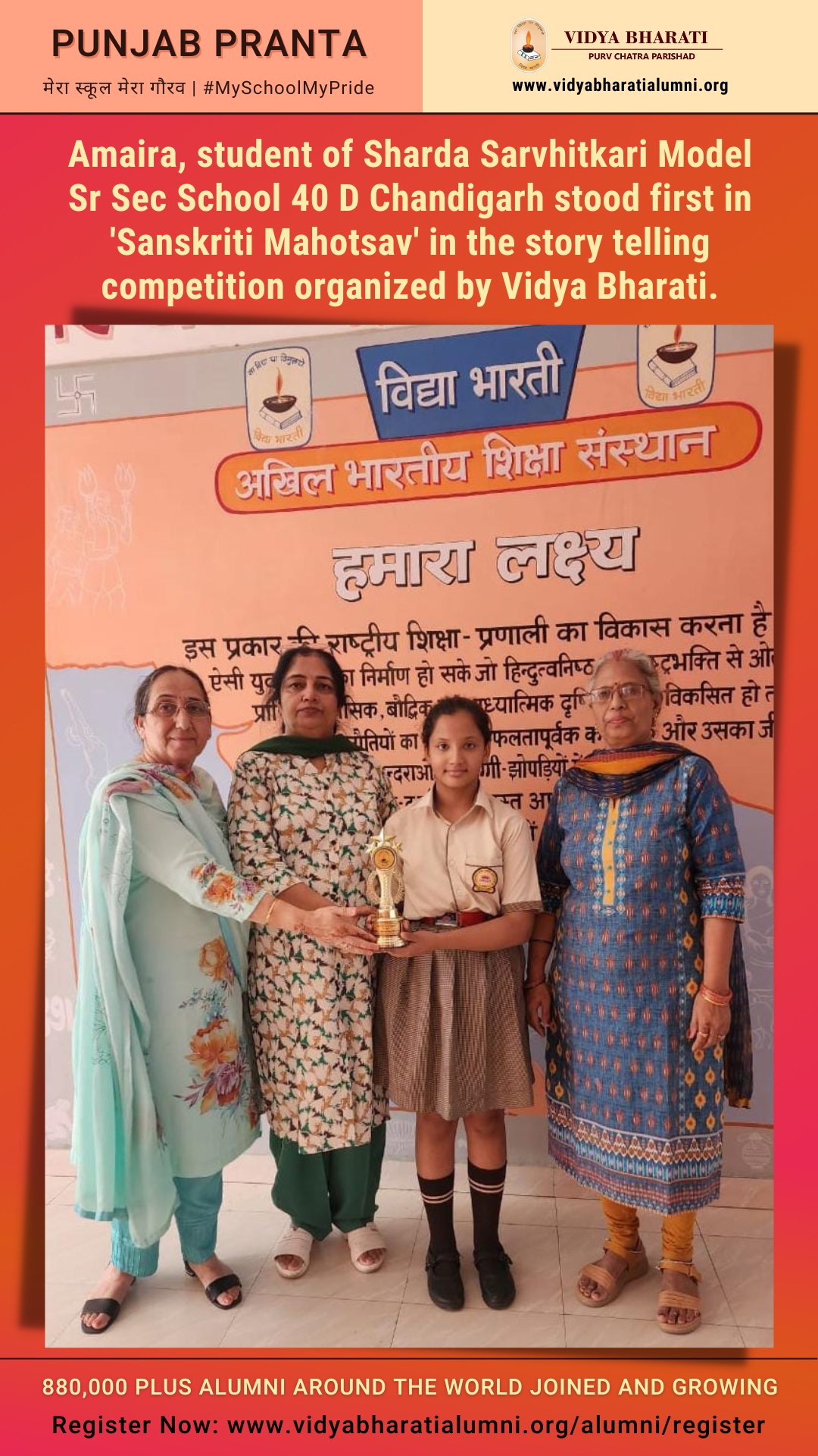amaira, student of sharda sarvhitkari model sr sec school 40 d chandigarh stood first in 'sanskriti mahotsav' in the story telling competition organized by vidya bharati.