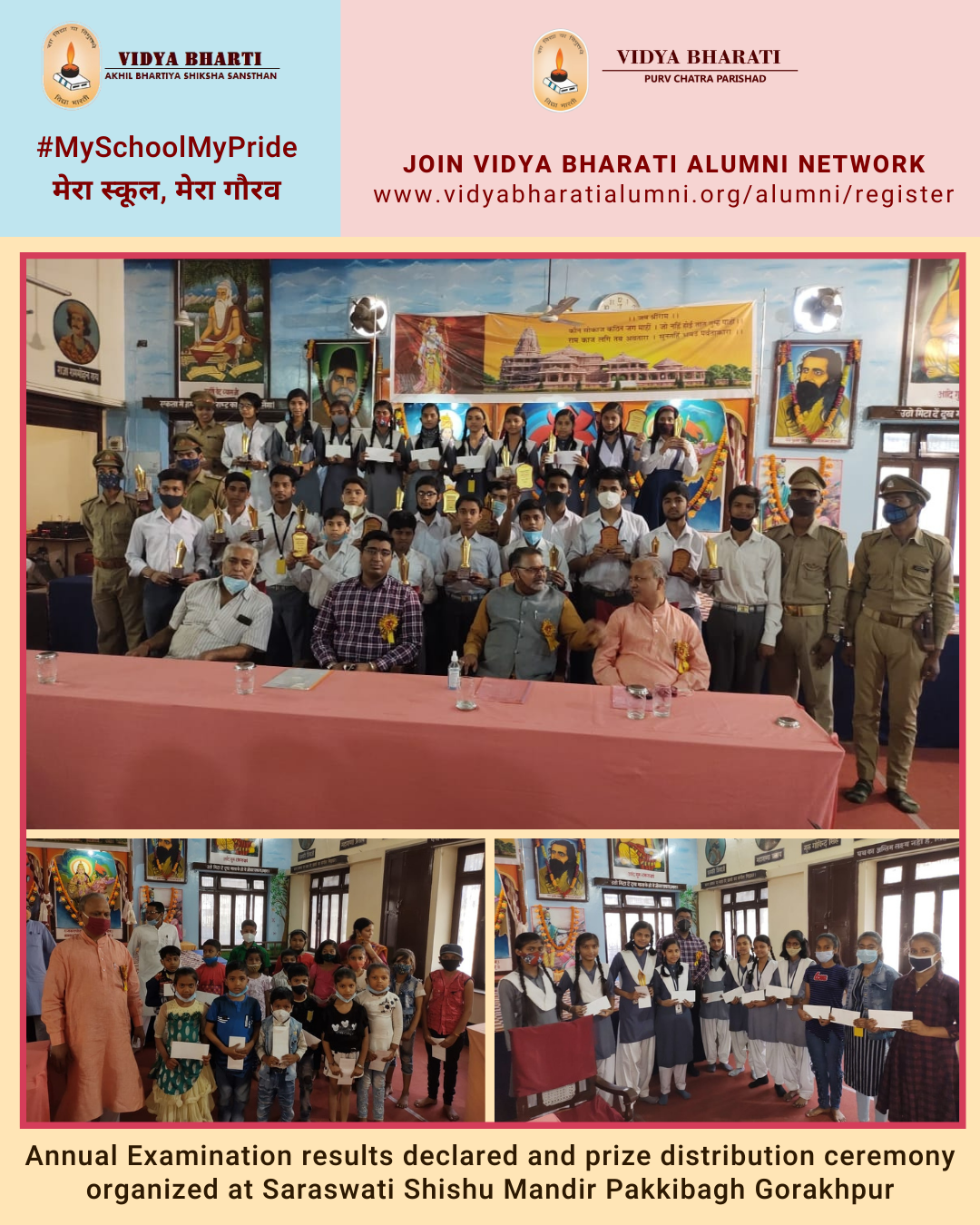 Annual Examination results declared and prize distribution ceremony organized at Saraswati Shishu Mandir Pakkibagh Gorakhpur. 99.19% students of 2020-21 session have passed. A total of 2126 students were registered, out of which 1626 students took the examination from home and the remaining 474 students will appear in the board examination.