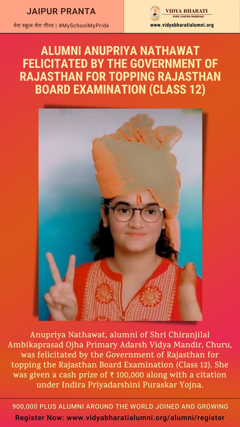Anupriya Nathawat, alumni of Shri Chiranjilal Ambikaprasad Ojha Primary Adarsh Vidya Mandir, Churu, was felicitated by the Government of Rajasthan for topping the Rajasthan Board Examination (Class 12). She was given a cash prize of ₹ 100,000 along with a citation under Indira Priyadarshini Puraskar Yojna.