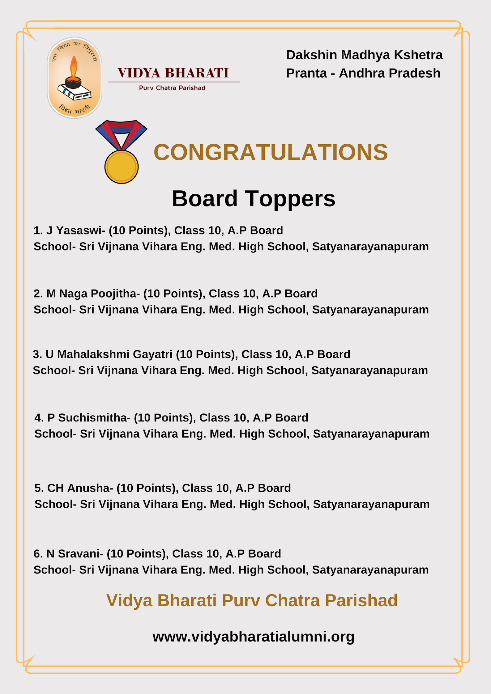 For listing meritorious students in the alumni portal (www.vidyabhartialumni.org) kindly write to info@vidyabharatialumni.org