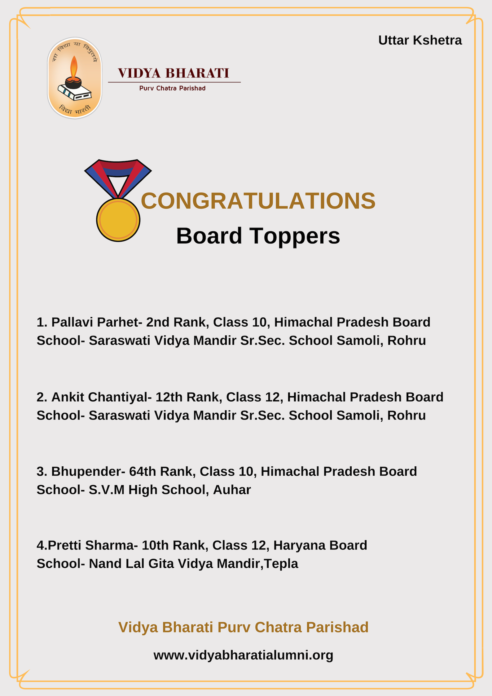 Congratulations to Pallavi Parhet, Ankit Chantiyal, Bhupender and Pretti Sharma from Uttar Kshetra for securing top positions in the board level.