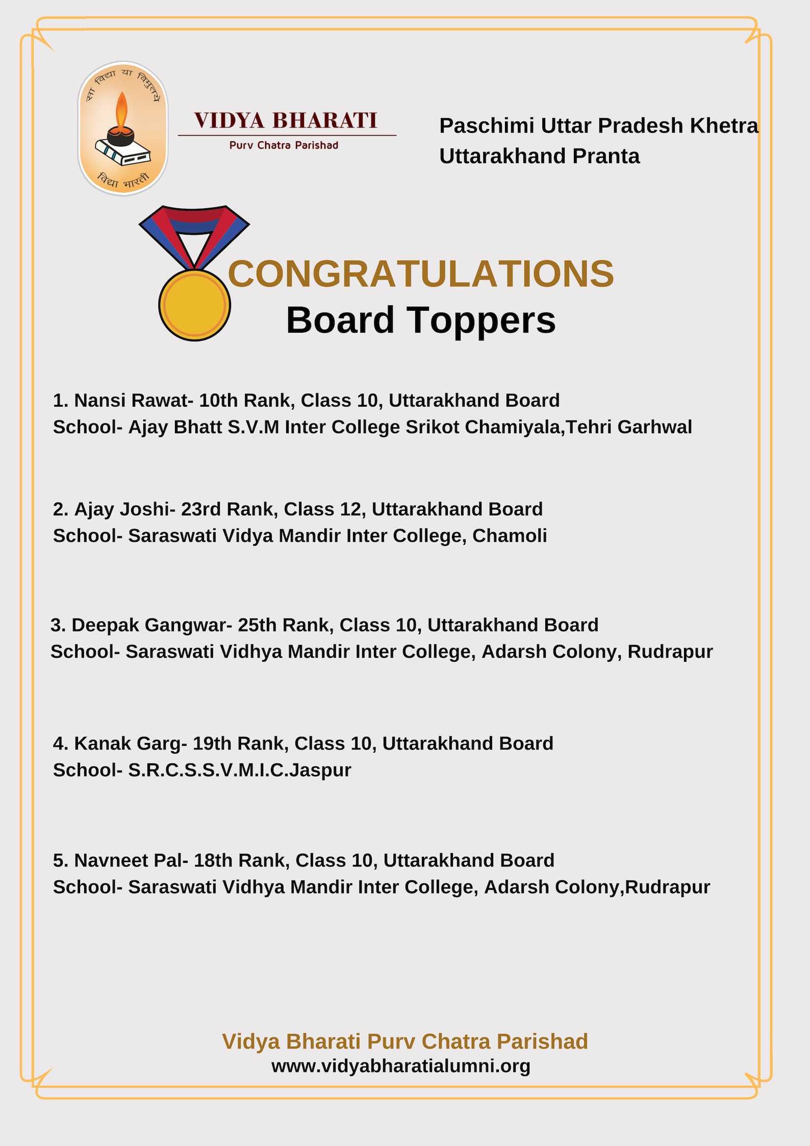Congratulations to Nansi Rawat, Ajay Joshi, Deepak Gangwar, Kanak Garg and Navneet Pal from Uttarakhand Pranta for securing ranks in the board level.