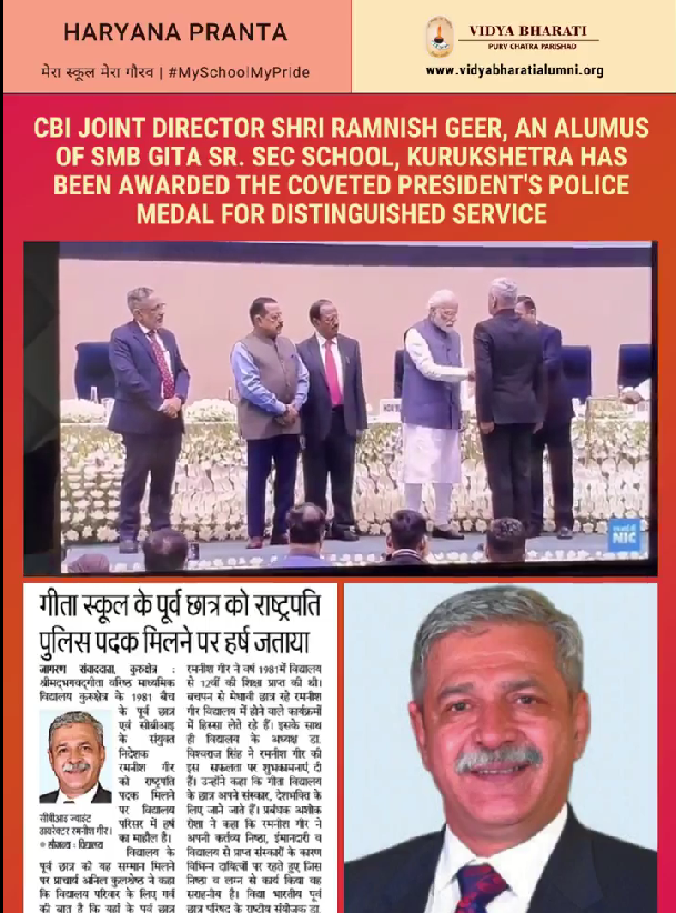 CBI joint director Ramnish Geer, an alumus of SMB Gita Sr. Sec School, Kurukshetra has been awarded the coveted President's Police Medal for Distinguished Service.