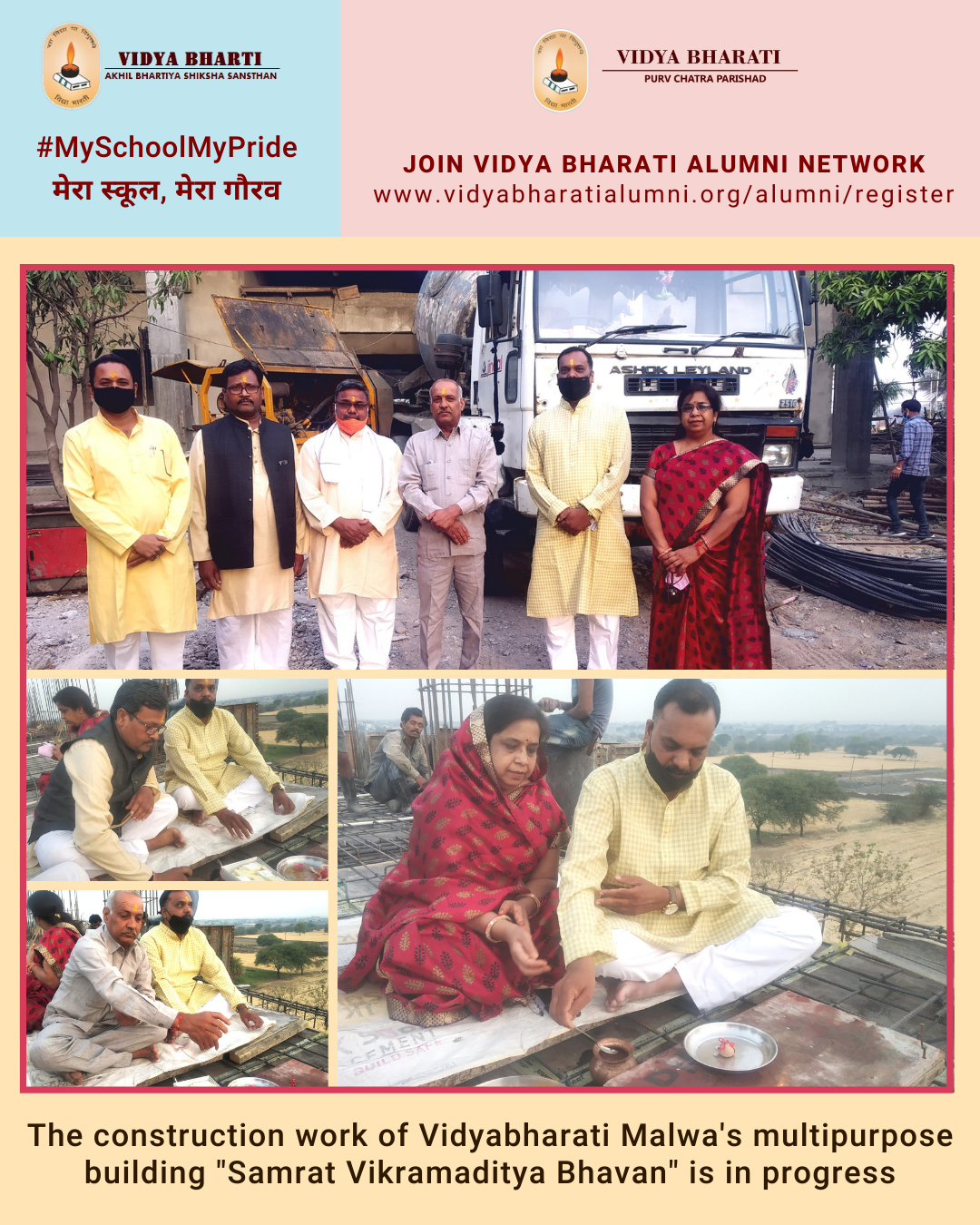 On the occasion of the fourth roof molding work in the Emperor Vikramaditya Bhavan, Shri Manish Goyal, Member of Saraswati Vidya Pratisthan Malwa Provincial Executive from Vidya Bharati Urban Area Education, Mr. Hakmsingh Anjana (Ranabdra), Tribal, Vice President of Rural Area Education Gram Bharati Education Committee, District Ujjain, Shri Mahesh God, Secretary of the Area Education, Mata Shabari Scheduled Tribe Service Trust, started the work by doing Devpujan.