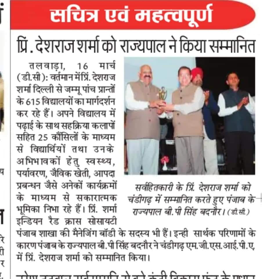 Deshraj Sharma Principal of Sarvhitkari school received honour from RajyaPal in Chandigarh. Deshraj Sharma is guiding 615 schools plus he is looking after the health issues. He is also a part of Indian Red Cross Society.
