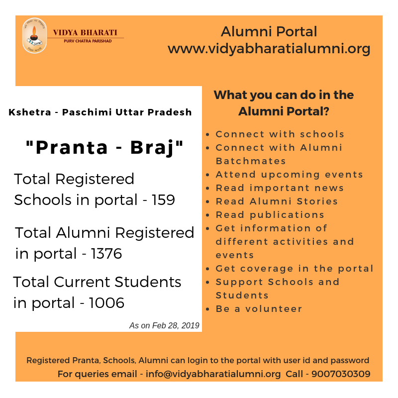 All Vidya Bharati schools can register in the alumni portal to network with alumni members.