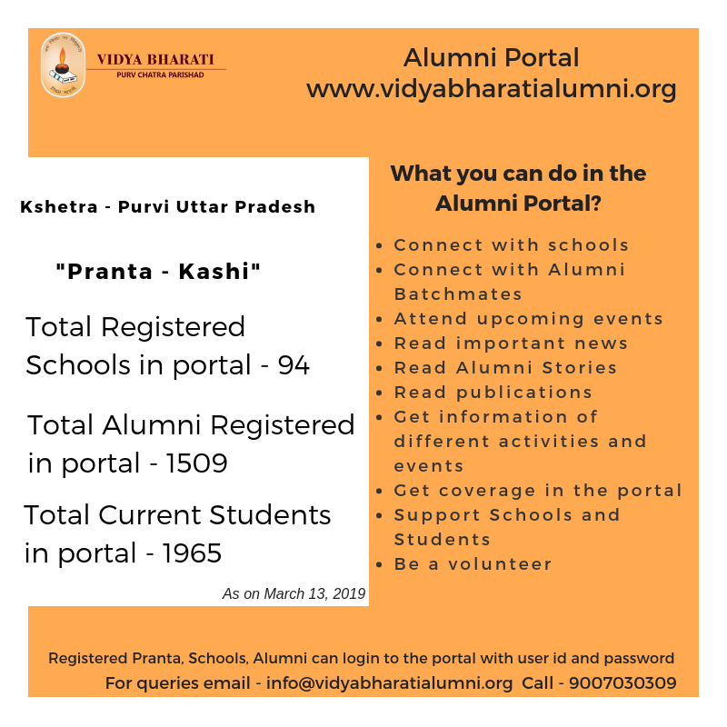All Vidya Bharati schools can register in the alumni portal to network with alumni members.