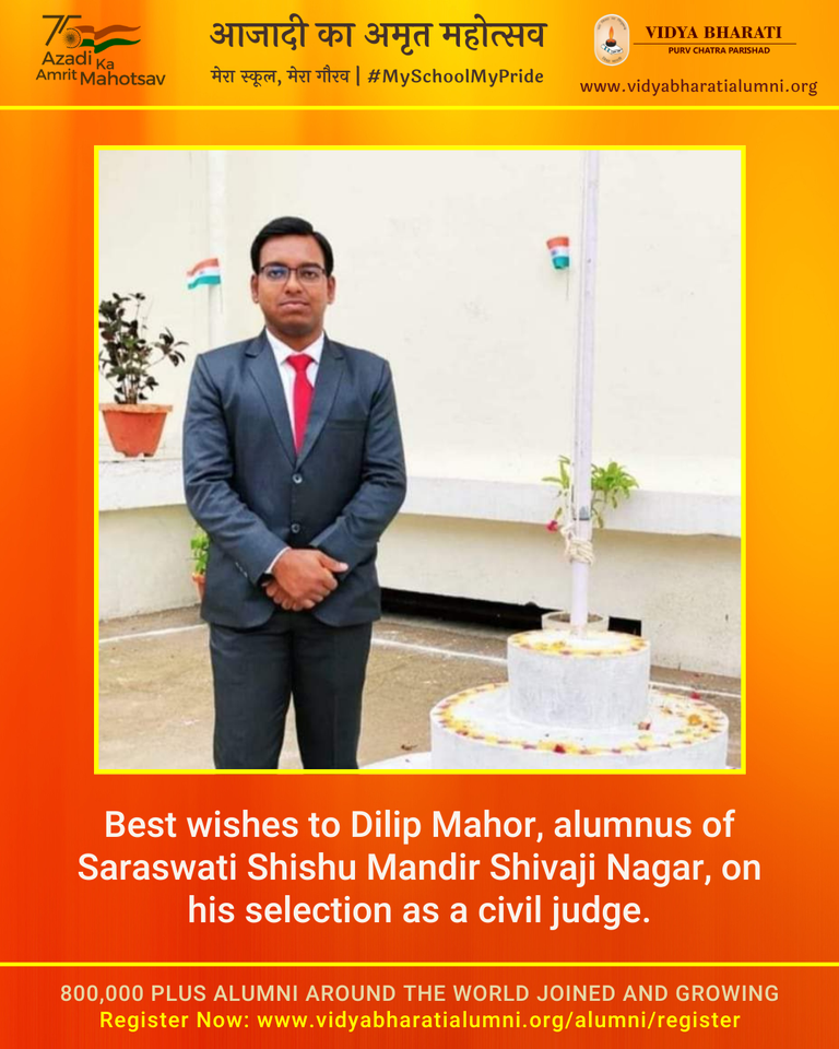 Best wishes to Dilip Mahor, alumnus of Saraswati Shishu Mandir Shivaji Nagar, on his selection as a civil judge.