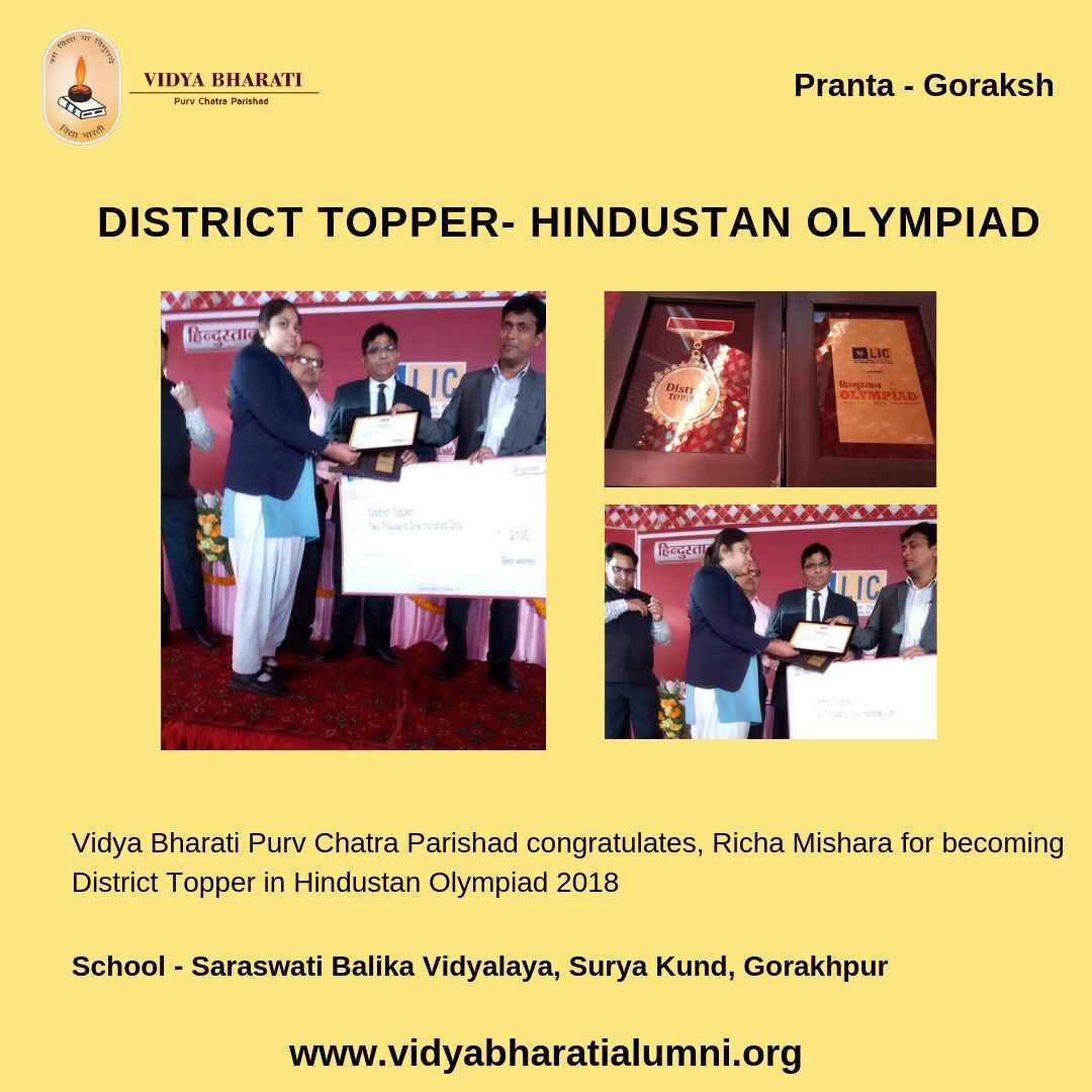 Vidya Bharati Purv Chatra Parishad congratulates Richa Mishara for becoming District Topper at Saraswati Balika Vidyalaya, Suryakund, Gorakhpur