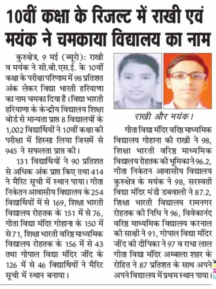 Excellent results at Vidya Bharati Haryana by Mayank and Rakhi at Class 10 C.BS.E Board Examinations who scored 98%. Around 131 students scored 90% and around 945 students did good results at Vidya Bharati Haryana schools