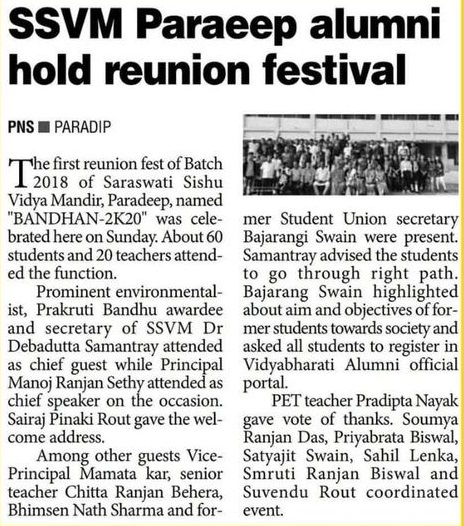 First alumni reunion held in Vidya Bharati school in Odisha. Environmentalist, Prakruti Bandhu awardee, Dr. Debadutta Samantray attended as chief guest.