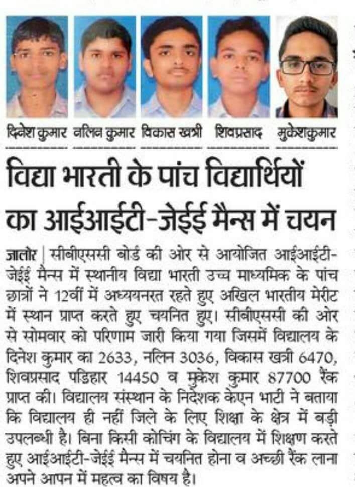 Five students from Vidya Bharati High Secondary were selected in the IIT-JEE MAINS organized by the CBSE board. The results which were released by CBSE, Dinesh Kumar secured 2633 rank, Nalin- 3036 rank, Vikas Khatri- 6470 rank, Shivprasad Padhir-14450 rank and Mukesh Kumar-87700 rank.