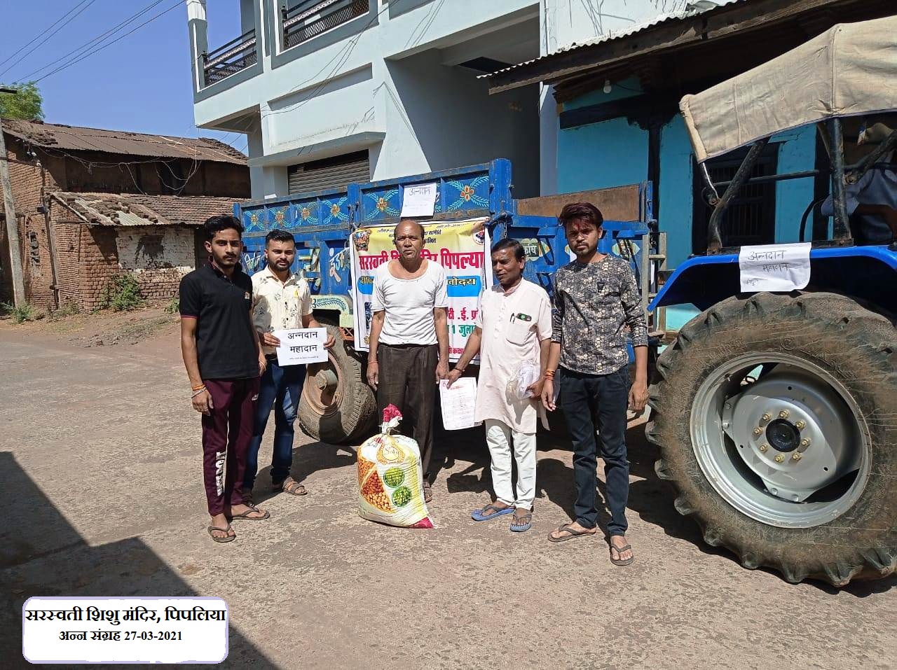 पिपल्या:- माधव ग्राम भारती शिक्षा समिति जिला हरदा द्वारा संचालित सरस्वती शिशु मंदिर पिपलिया, ग्रामीण क्षेत्र में चलने वाला सांस्कृतिक विद्यालय है l विद्यालय के भौतिक संसाधन, शैक्षिक संसाधन एवं विद्यालय की व्यवस्थाओं को ठीक करने हेतु आज दिनांक "27 मार्च 2021" को ग्राम में ट्रैक्टर वाहन द्वारा अन्न संग्रह किया गया, ग्राम पिपलिया मे विगत 2 दिवसों से चल रहे अन्न संग्रह कार्यक्रम के आज तृतीय दिवस पर जिला हरदा के तहसील प्रमुख श्री योगेश जी माकवे, संकुल विद्यालय सिराली से श्री शंकर लाल जी पटवा, सरस्वती शिशु मंदिर पिपलिया से प्रधानाचार्य- श्री धर्मेंद्र ठाकुर जी के साथ पूर्व छात्र समूह पिपलिया के सदस्य- दुर्गेश भैया मालवीय, *राजा भैया सोलंकी, रवि भैया मालवीय भैया विकास, भैया कोशल, भैया अनुराग एवं आशुतोष तथा विद्यालय संयोजक मंडल के साथ ग्राम के सम्मानीय गण का भी सहयोग मिला l