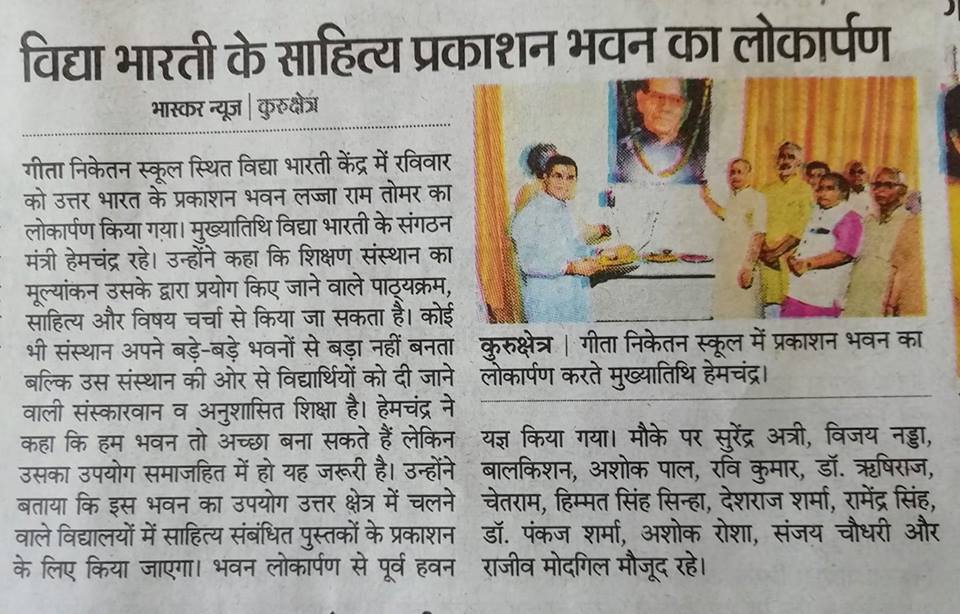 A publishing house was inaugrated by Chief Guest Hemchandra Ji at Gita Niketan School. He suggested that every institution should be created on the basis of historical education and topical discussion and its utilization is necessary for the development of society. Several dignitaries were present at this inaugration