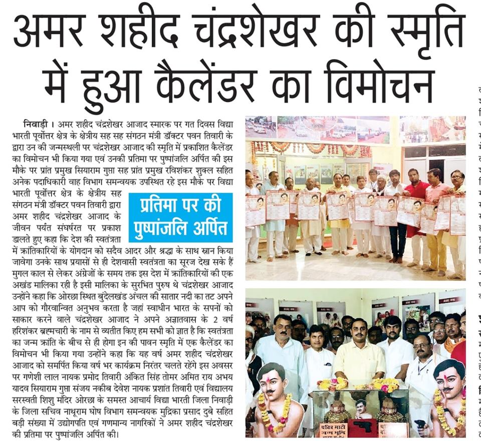 Vidya Bharati Purvottar kshetra Sanghathan Mantri Dr Pawan Tiwari inaugurated a calendar in the memory of Chandrashekhar Azad. Dr Pawan Tiwari gave a speech on Freedom Fighter Chandrashekhar Azad and due to him our India got independence. Dr Pawan Tiwari paid tribute to the idol of Chandrashekhar Azad.