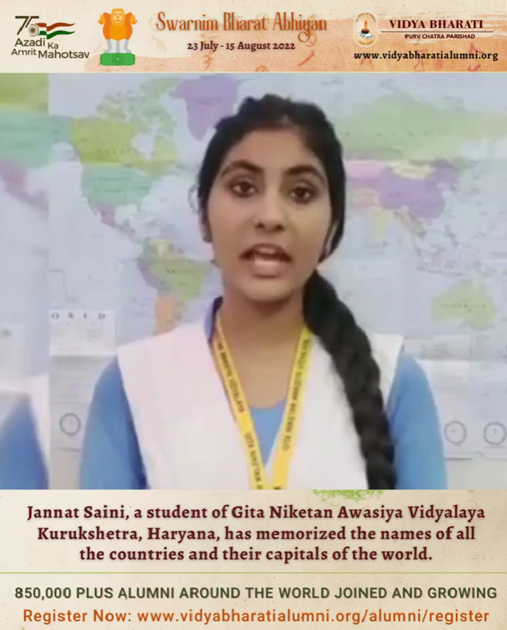 Jannat Saini, a student of Gita Niketan Awasiya Vidyalaya Kurukshetra, Haryana, has memorized the names of all the countries and their capitals of the world.