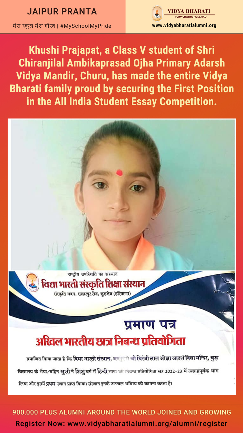 Khushi Prajapat, a Class V student of Shri Chiranjilal Ambikaprasad Ojha Primary Adarsh Vidya Mandir, Churu, has made the entire Vidya Bharati family proud by securing the First Position in the All India Student Essay Competition.
