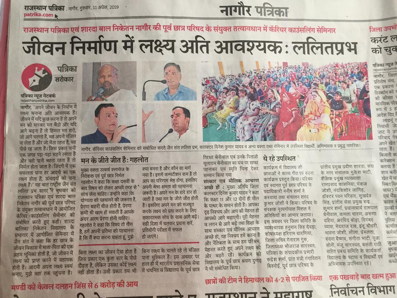 Lakshya Programme was held on 10th April 2019 at Sharda Bal Niketan Nagaur. Career Counselling seminar was conducted in this school. The motive of Career counselling seminar was to brighten the future of the students and hardwork is the key to success. This programme was attended by Sarvan Dugad, motivational speaker for class 9 to 12 students, Collector Dinesh Yadav appeared as a guest, Mohan Choudhary M.L.A. Around 400 students were benefitted from this seminar.