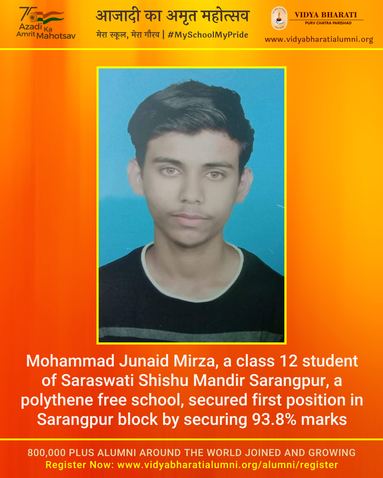 Mohammad Junaid Mirza, a class 12 student of Saraswati Shishu Mandir Sarangpur, a polythene free school, secured first position in Sarangpur block by securing 93.8% marks.