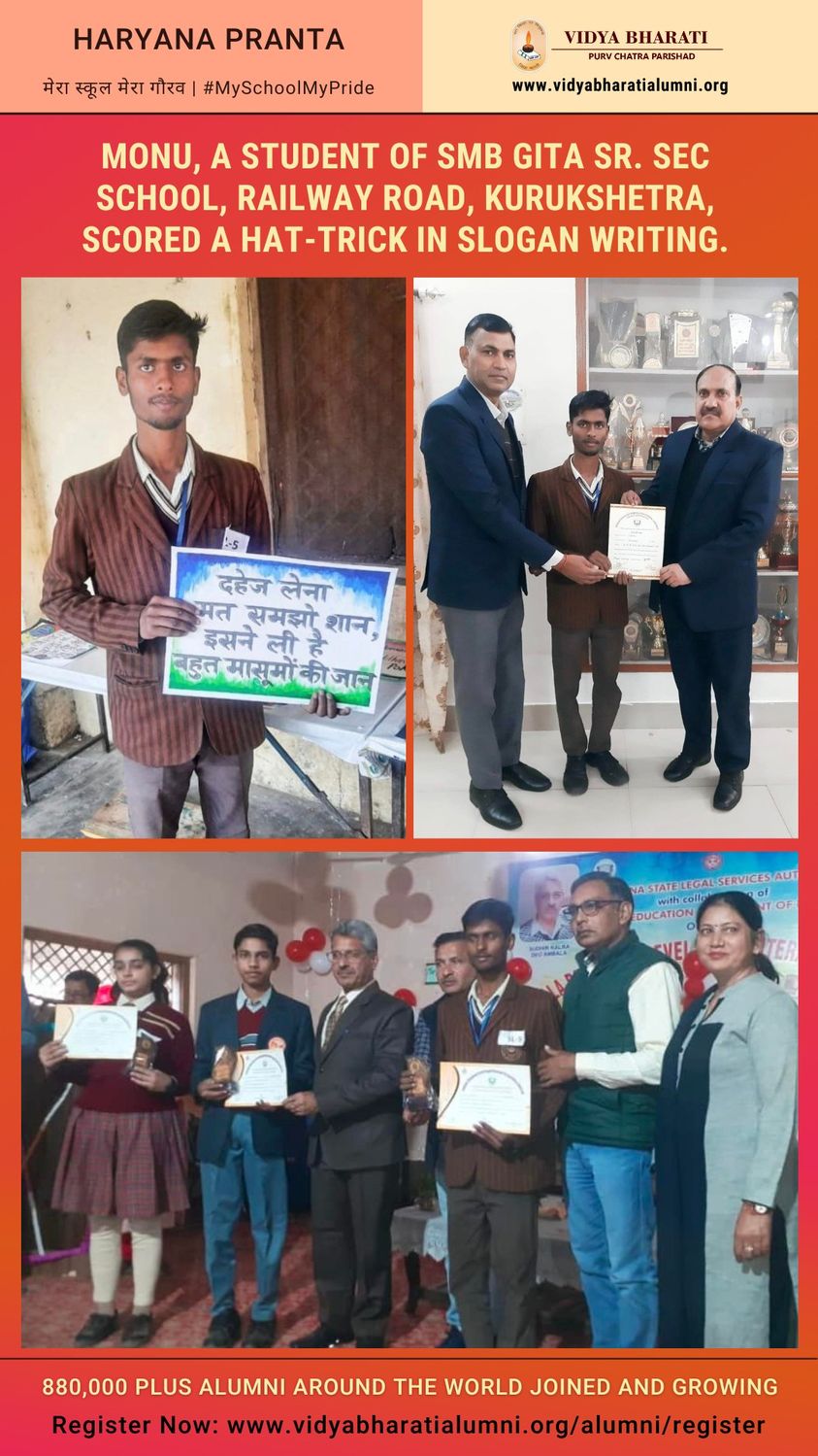 Monu, a student of SMB Gita Sr. Sec School, Railway Road, Kurukshetra, scored a hat-trick in slogan writing.