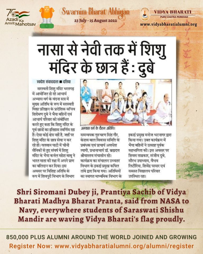 Shri Siromani Dubey ji, Prantiya Sachib of Vidya Bharati Madhya Bharat Pranta, said from NASA to Navy, everywhere students of Saraswati Shishu Mandir are waving Vidya Bharati's flag proudly.