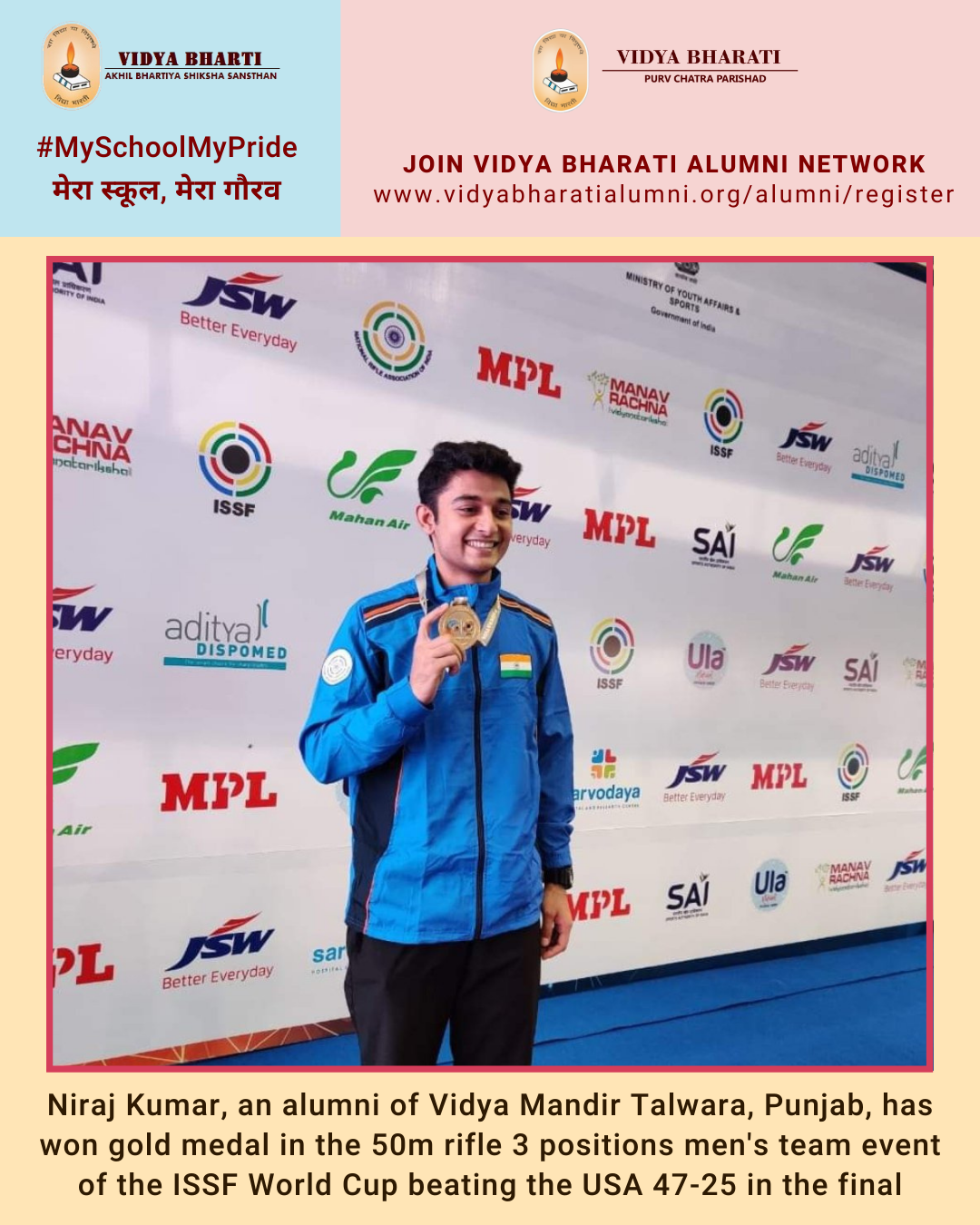 Niraj Kumar, an alumni of Vidya Mandir Talwara, Punjab, has won gold medal in the 50m rifle 3 positions men's team event of the ISSF World Cup beating the USA 47-25 in the final.
