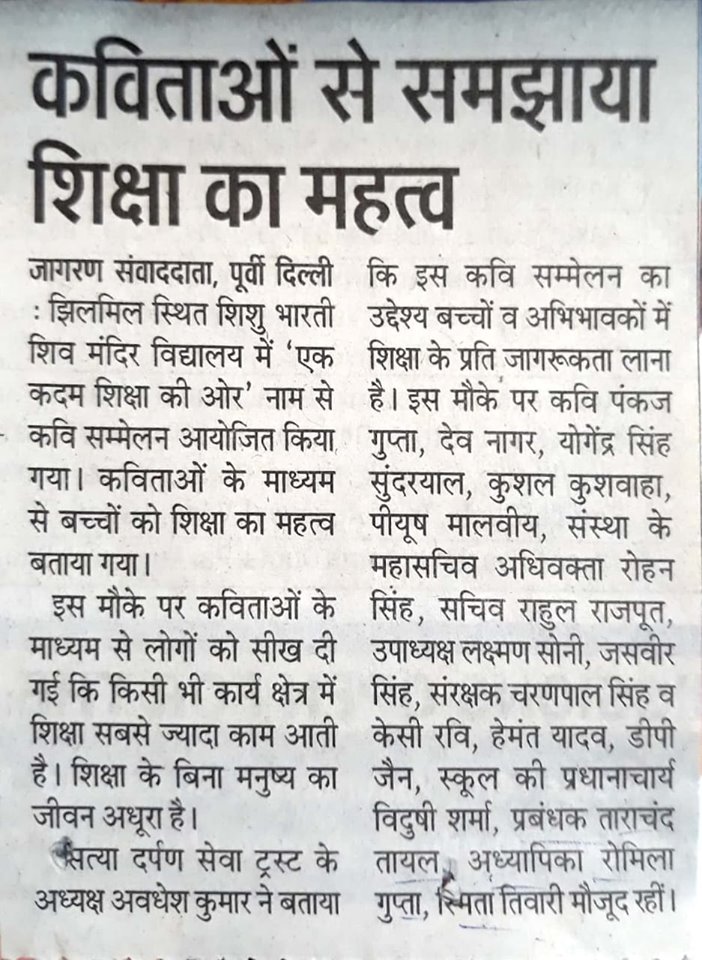 At Shishu Bharti Shiv Mandir Vidyalay on the name of 'Ak Kadam Shiksha Ki Or' Poetry meet was held. Through poems the importance of education was explained to the students. Satya Darpan Sewa Trust Adhyaksh, Avdhesh Kumar also deliberated about the awareness of education. Famous poets Pankaj Gupta, Dev Nagar and Yogendra Singh Sudaryal and Principal Romila Gupta werte present at this event.