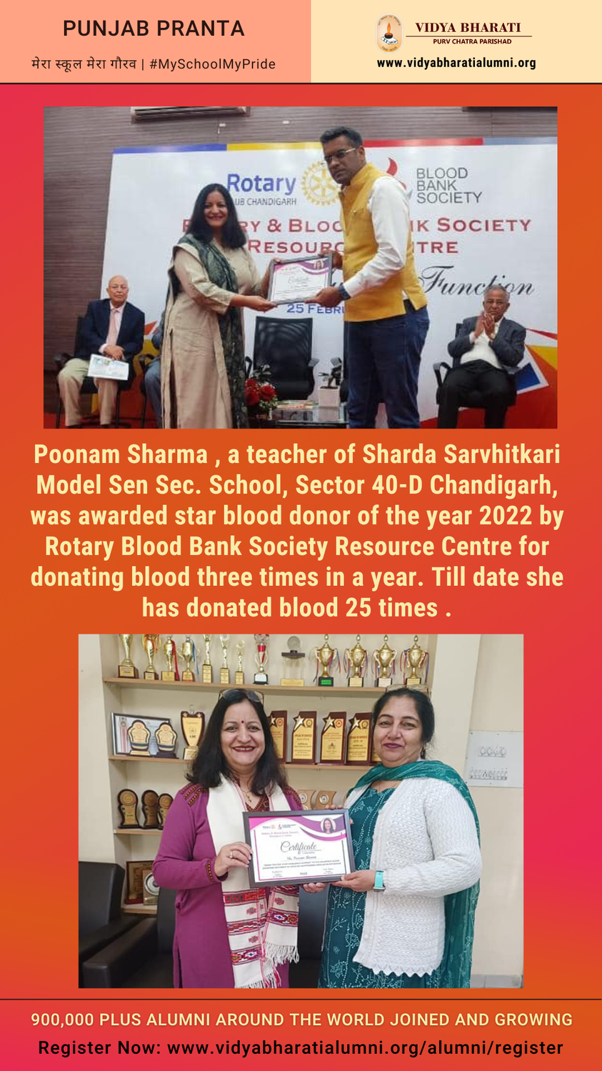 Poonam Sharma, a teacher of Sharda Sarvhitkari Model Sen Sec. School, Sector 40-D Chandigarh was awarded star blood donor of the year 2022 by Rotary Blood Bank Society Resource Centre for donating blood three times in a year. Till date she has donated blood 25 times .