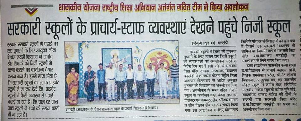 On the advise of Shaskiya Yojna Rashtriya Shiksha Abhiyan Hoshanabad of Saraswati Vidya Mandir Uchhatar Madhyamik, Bankhedi decided to conduct an inspection regarding the administration of education, computer labs etc. On the basis of this inspection 5 best schools were selected.