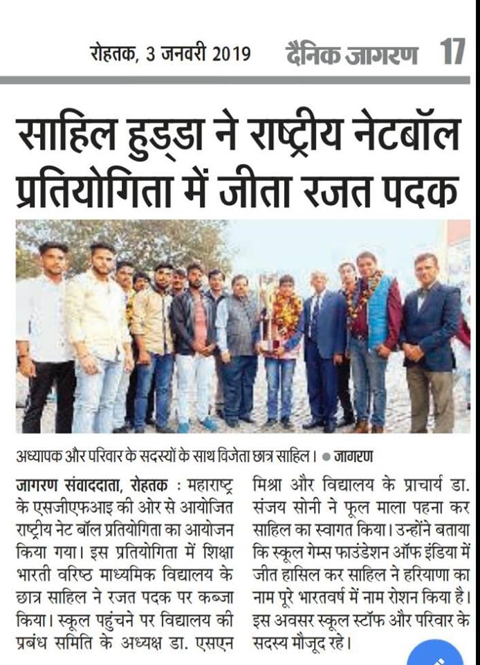 National Netball Competition was organized by Maharashtra SGFI.Sahil Hooda,student from Shiksha Bharati Senior Secondary School ,conferred silver medal in this competition and made the name of his School and State illuminated.