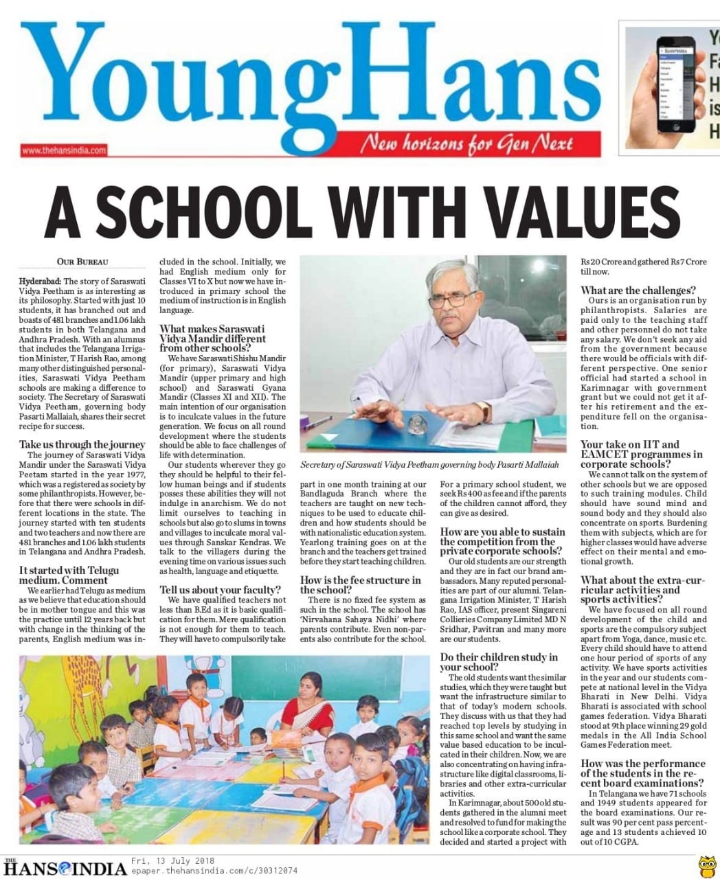 Hyderabad: The story of Saraswati Vidya Peetham is as interesting as its philosophy. Started with just 10 students, it has branched out and boasts of 481 branches and 1.06 lakh students in both Telangana and Andhra Pradesh. With an alumnus that includes the Telangana Irrigation Minister, T Harish Rao, among many other distinguished personalities, Saraswati Vidya Peetham schools are making a difference to society.