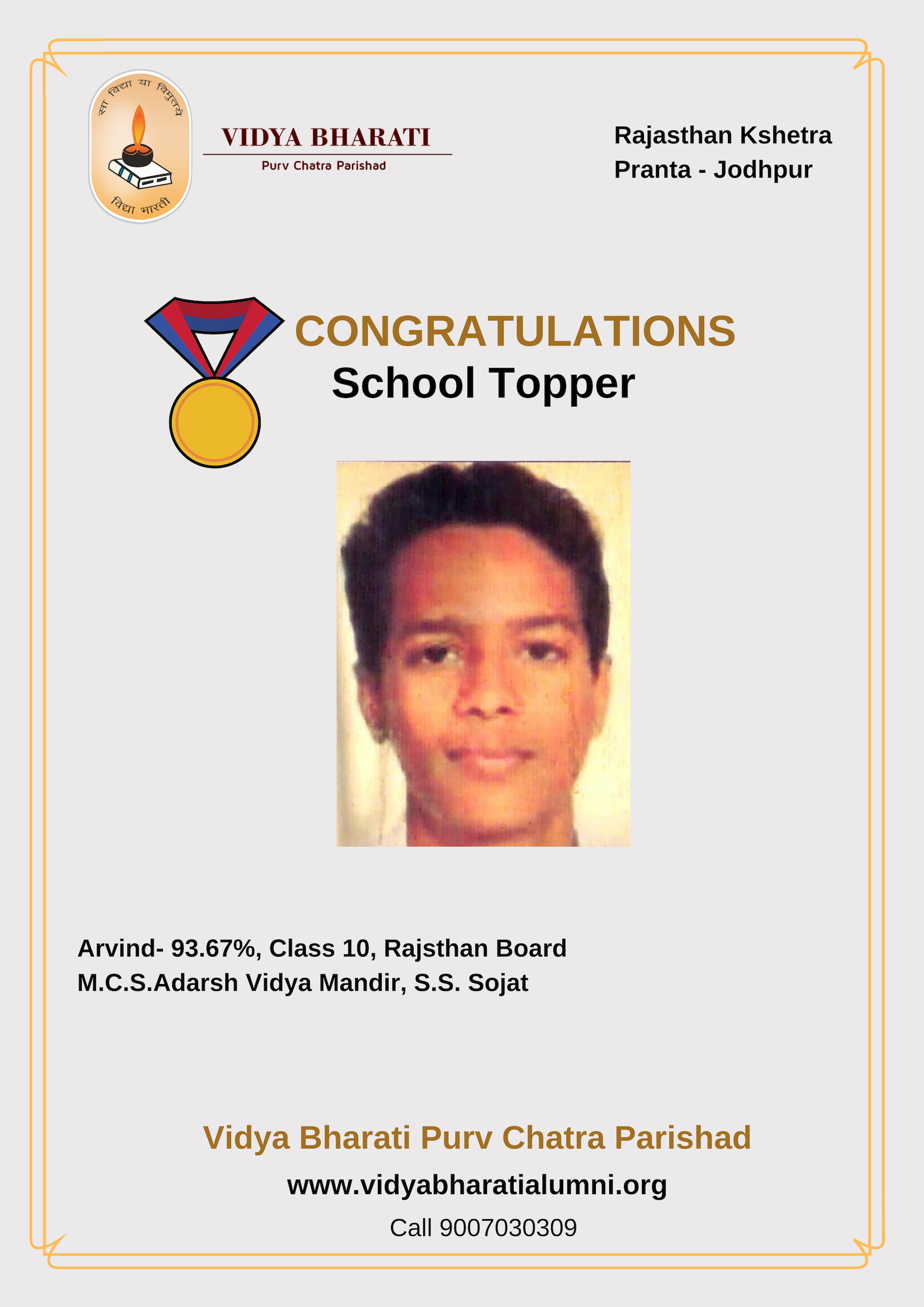 Congratulations to Arvind from M.C.S Adarsh Vidya Mandir, SS Sojat in Jodhpur Pranta for securing top position in his school