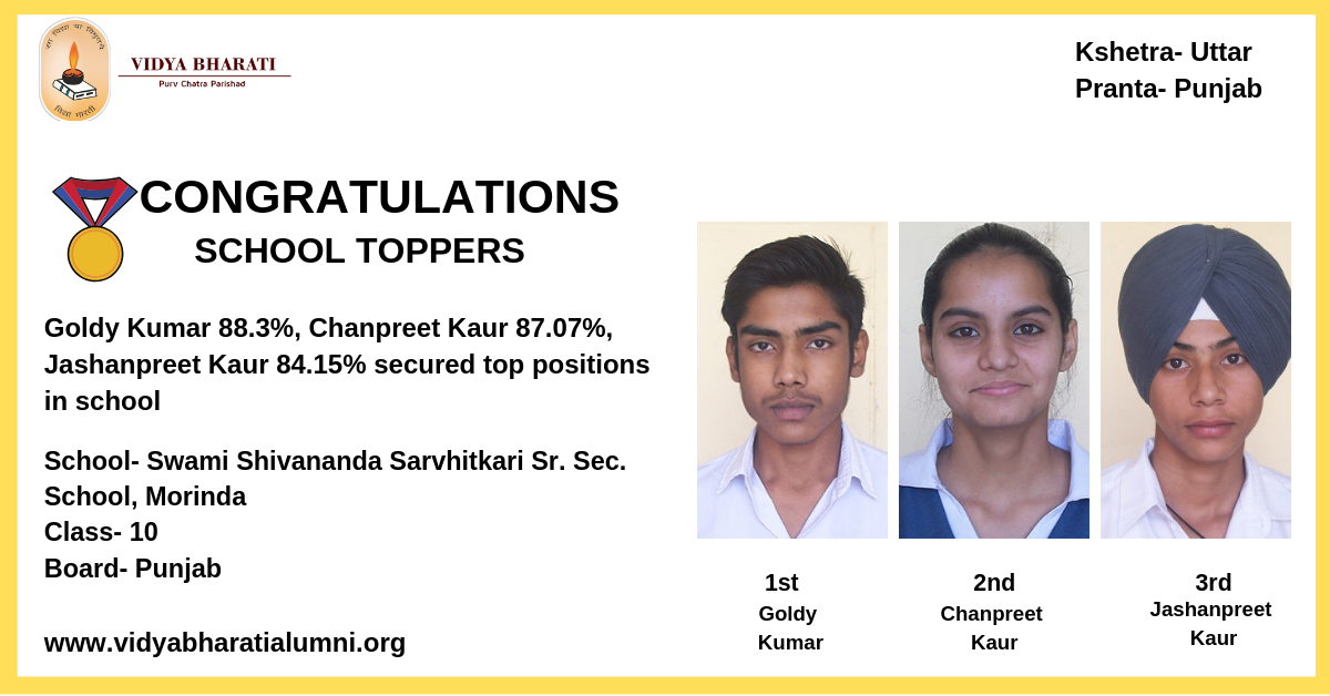 Class 10 board examination school toppers, Goldy Kumar, Chanpreet Kaur and Jashanpreet Kaur of Swami Shivananda Sarvhitkari Sr. Sec. School, Morinda in Punjab.