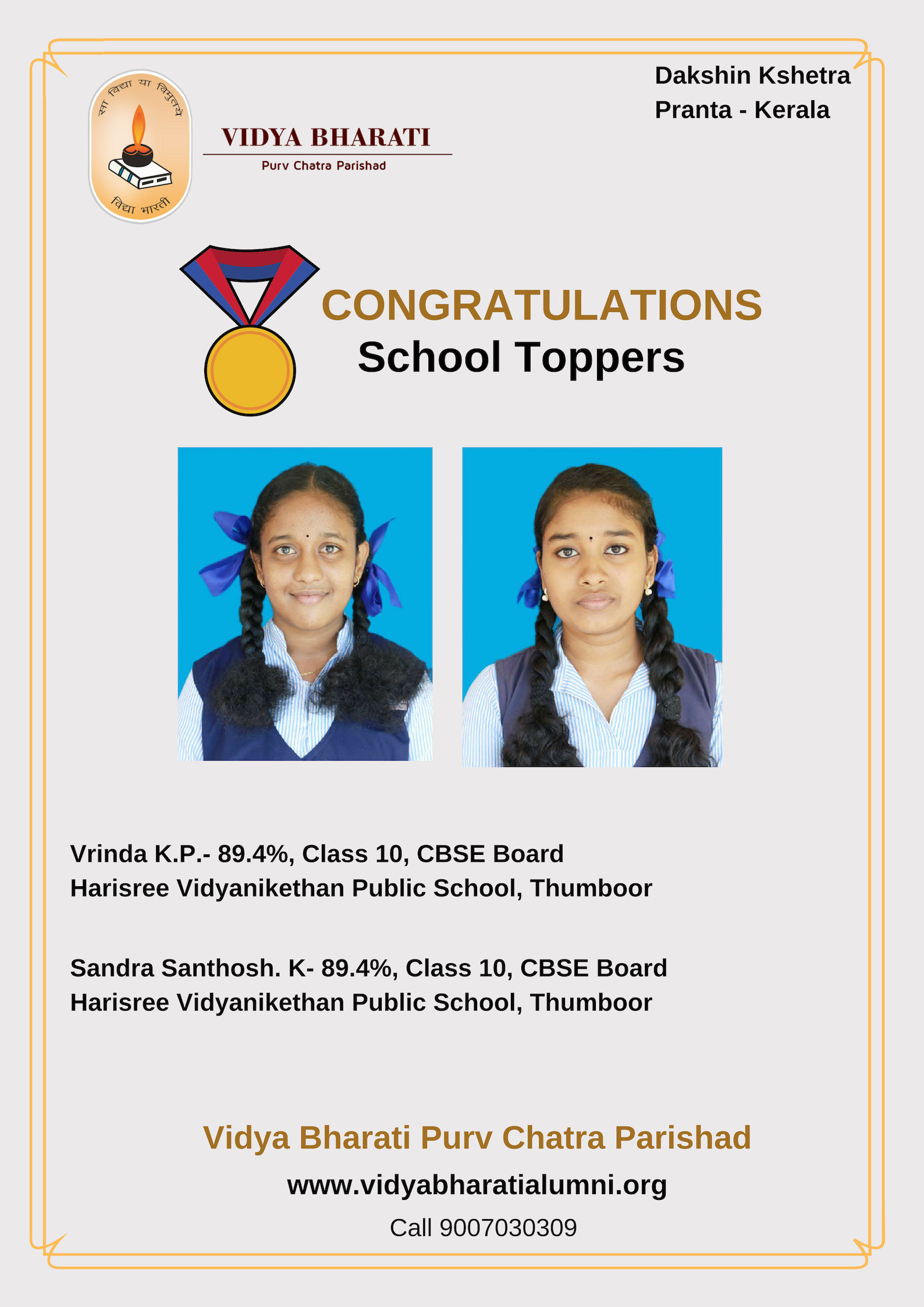 We congratulate Vidya Bharati Students Vrinda K.P and Sandra Santhosh K., School Toppers from Harisree Vidyanikethan Public School, Thumboor from Kerala Pranta.