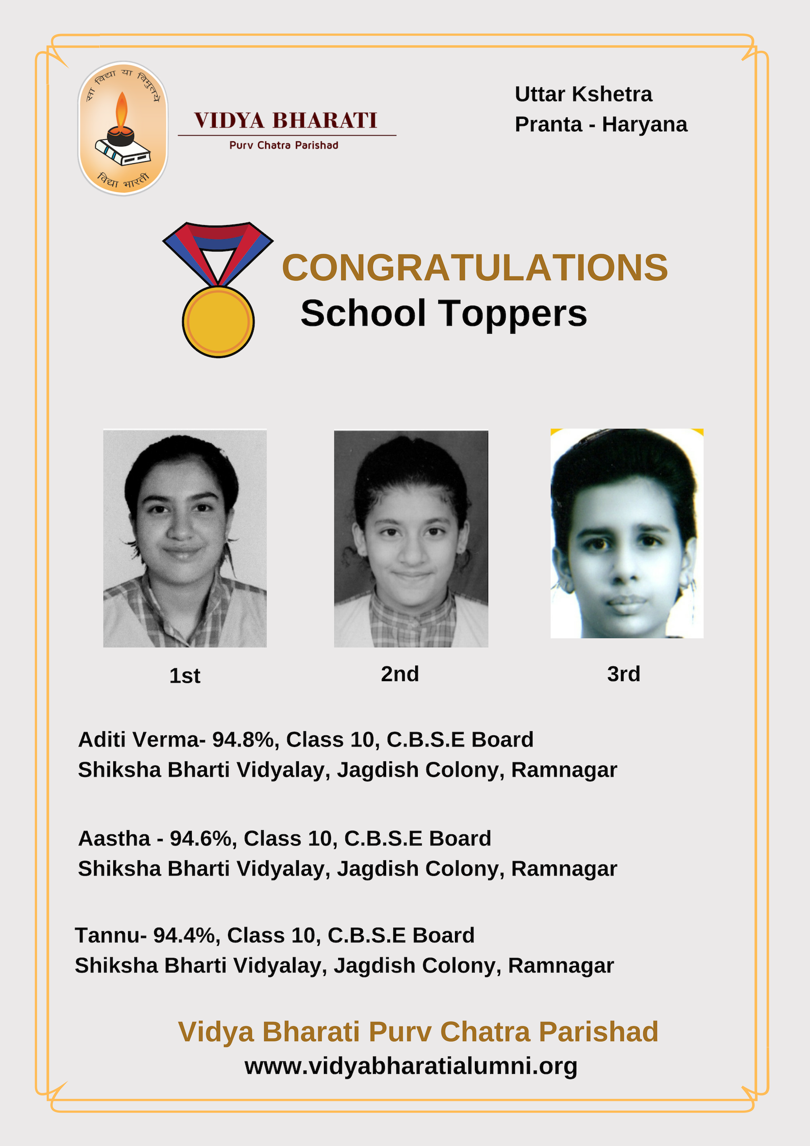 Congratulations to Aditi Verma, Aastha and Tannu from Shiksha Bharti Vidyalay, Jagdish Colony, Ramnagar in Haryana Pranta for securing top positions in their school.