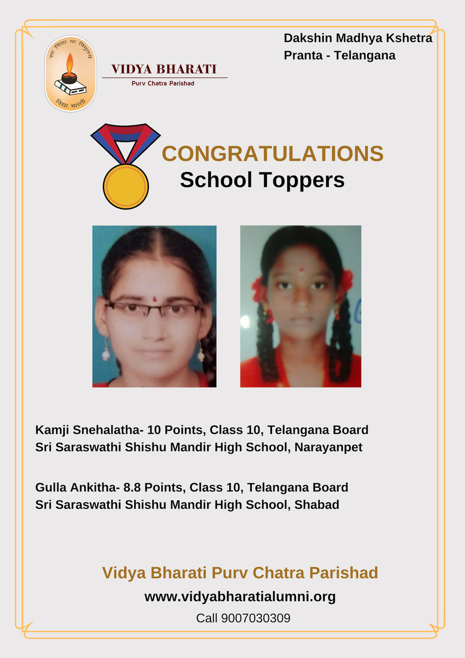 Congratulations to Kamji Snehalatha from Sri Saraswathi Shishu Mandir High school, Narayanpet and Gulla Ankitha from Sri Saraswathi Shishu Mandir High school, Shabad in Telangana Pranta for securing top positions in their schools.