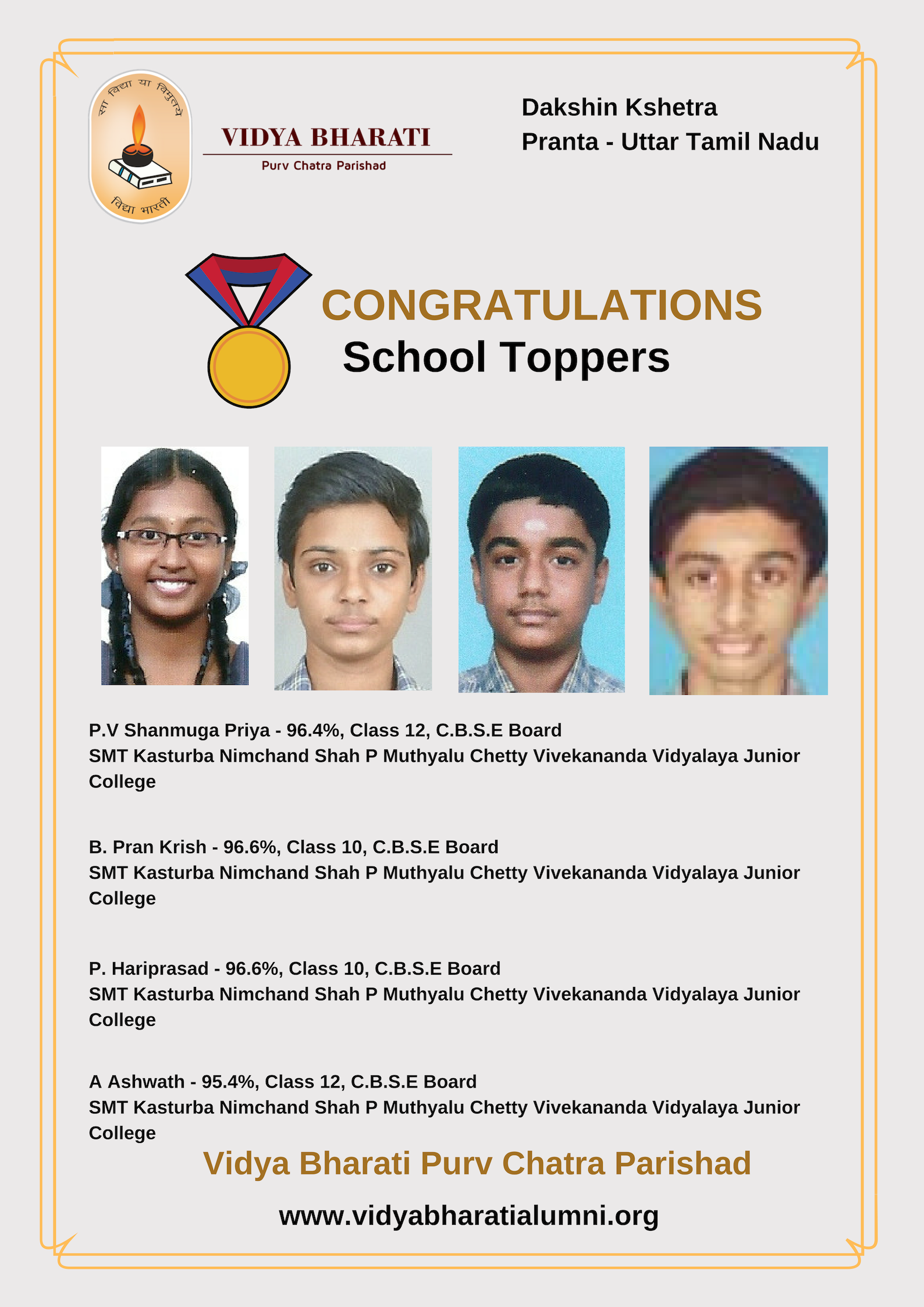 Congratulations to P. V Shanmuga Priya, B. Pran Krish, Hariprasad and A. Ashwath from SMT Kasturba Nimchand Shah P Muthyalu Chetty Vivekananda Vidyalaya Junior College in Uttar Tamil Nadu Pranta for securing top positions in their school.