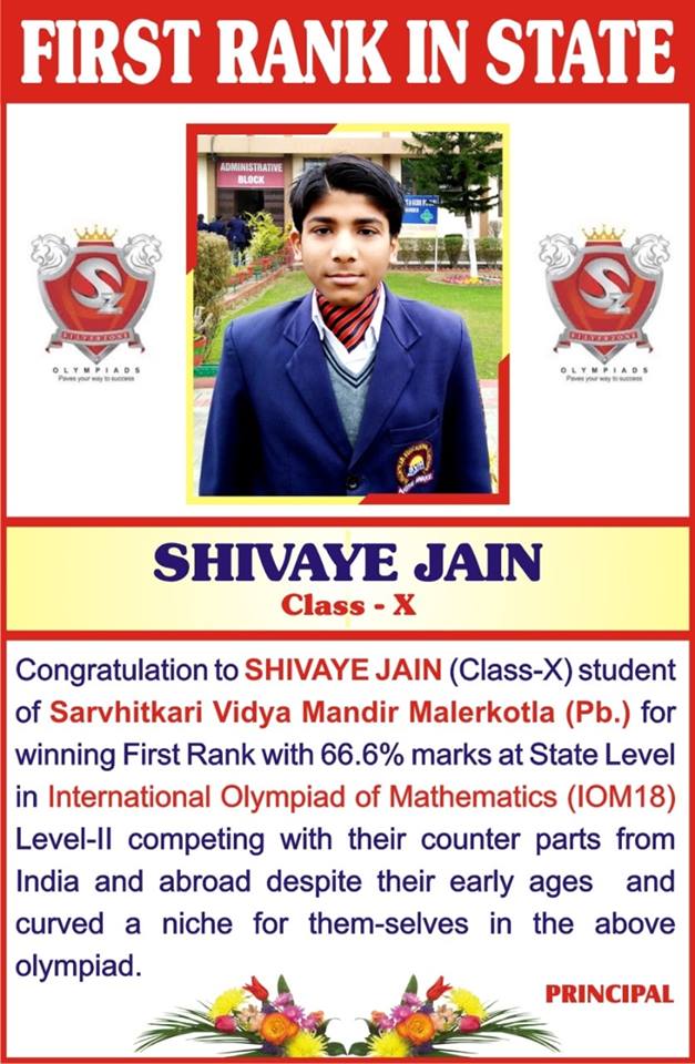 Shivaye Jain class 10 studentĀ from Sarvhitkari Vidya Mandir Malerkotla secured 1st rank at State level in International Olympiad of Mathematics having 66.6% marksĀ