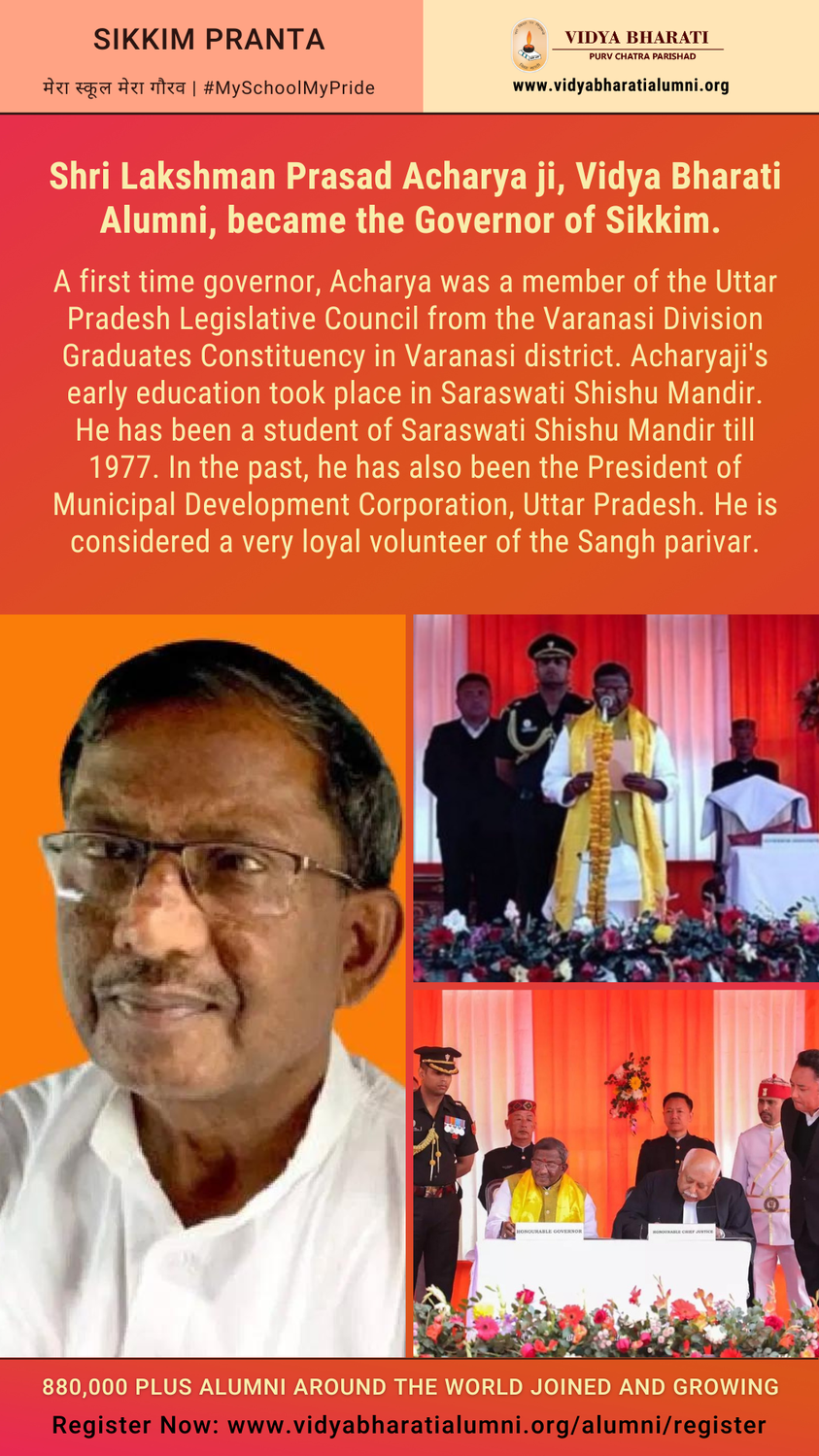 Shri Lakshman Prasad Acharya ji, Vidya Bharati Alumni, became the Governor of Sikkim. A first time governor, Acharya was a member of the Uttar Pradesh Legislative Council from the Varanasi Division Graduates Constituency in Varanasi district. Acharyaji's early education took place in Saraswati Shishu Mandir. He has been a student of Saraswati Shishu Mandir till 1977. In the past, he has also been the President of Municipal Development Corporation, Uttar Pradesh. He is considered a very loyal volunteer of the Sangh parivar.